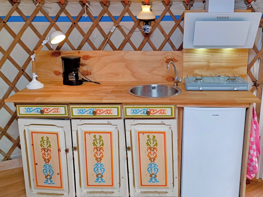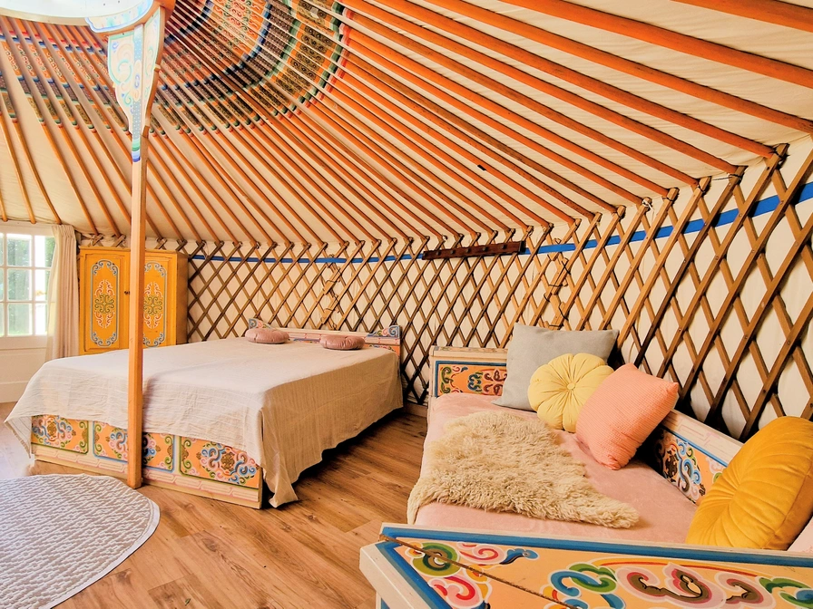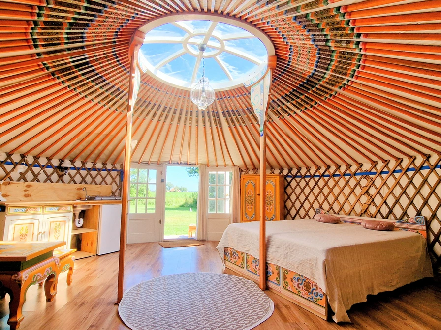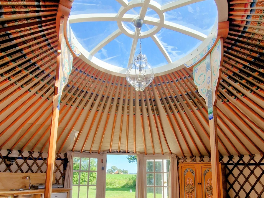 Overnacht in een traditionele yurt en ervaar een bijzonder verblijf. De yurt heeft handgeschilderde Mongoolse meubels en kleurrijke kussens. Vanuit het bed kijk je uit over de weilanden. Binnen staat een tweepersoonsbed van 1.60 x 2.00 met tweepersoonsdekbed en twee eenpersoonsbedden van 80 x 2.00 met eenpersoonsdekbedden. De yurt is geschikt voor maximaal vier personen. Bedlinnen neem je zelf mee. Keukenlinnen is aanwezig. Er is een eenvoudige keuken met een tweepits gastoestel, een koelkast en koud stromend water.