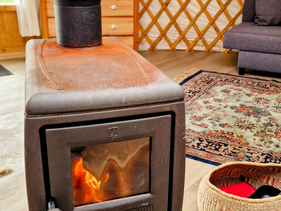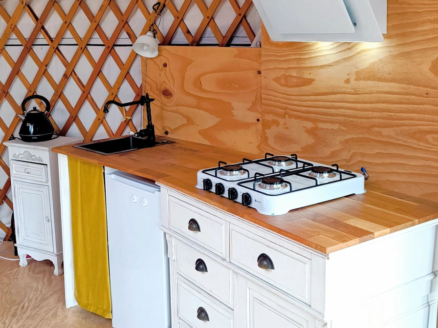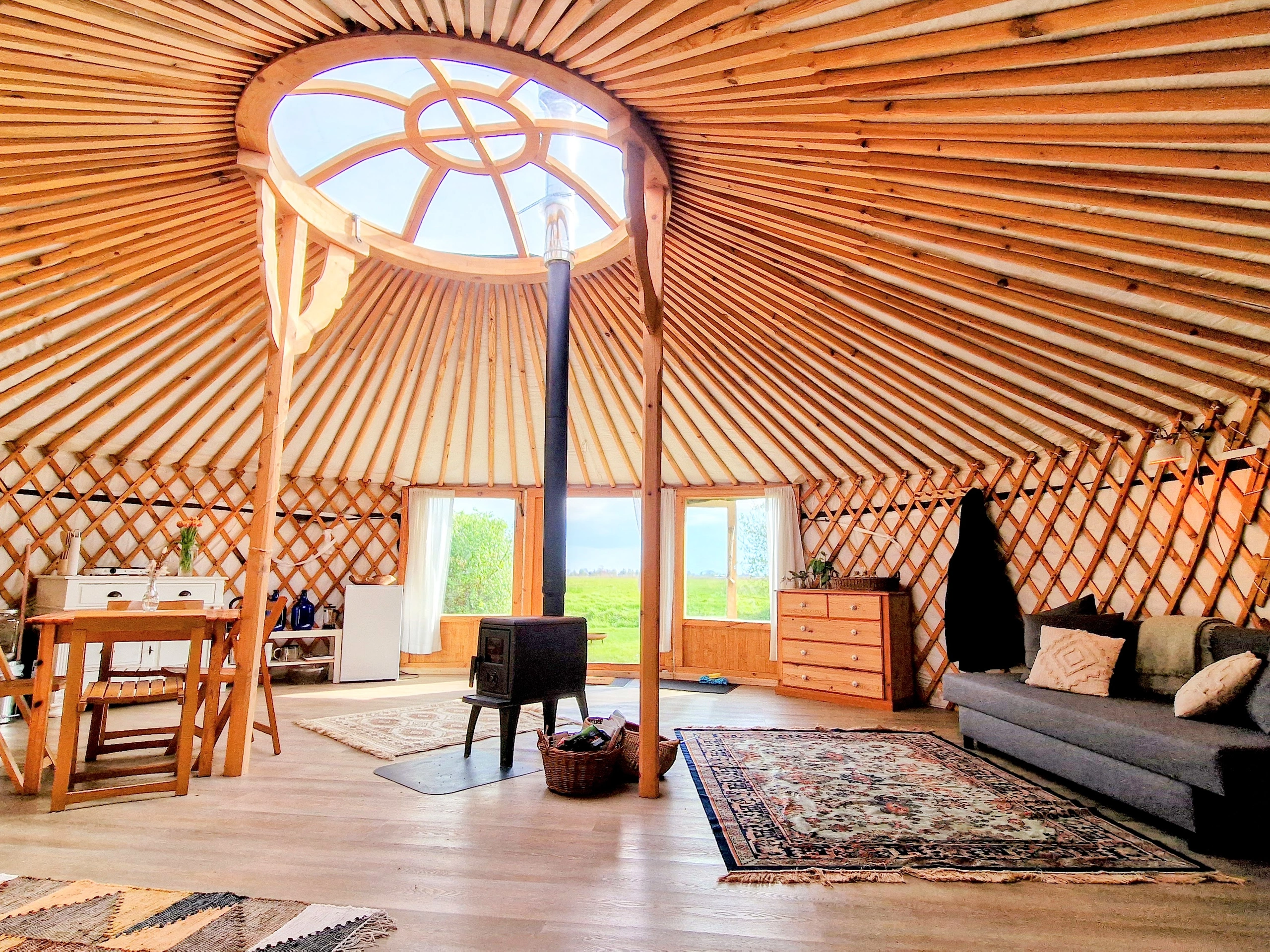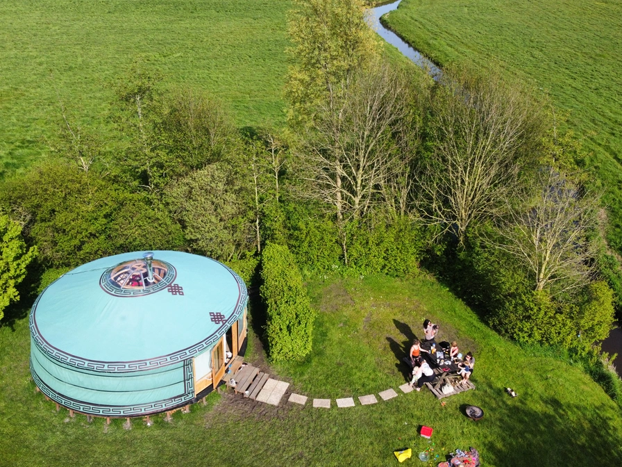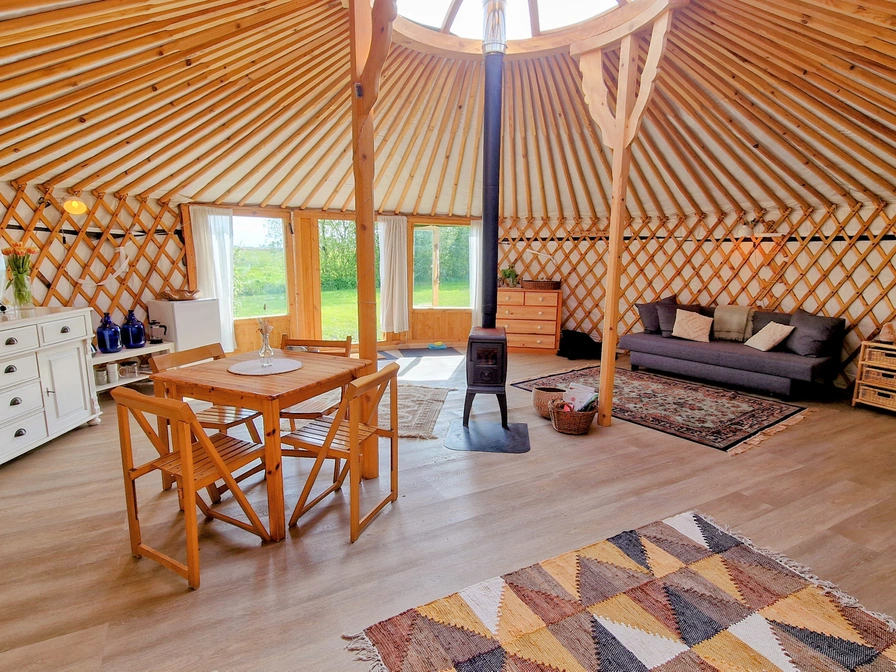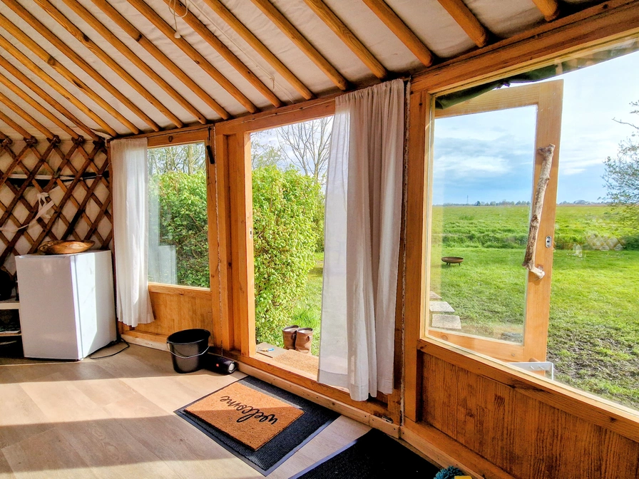 De grote yurt ligt op een prachtige plek aan de rand van het weiland en biedt een unieke kampeerervaring. Binnen vind je twee ruime slaapbanken, een eettafel en een eenvoudig keukentje met een eenpits kooktoestel, koelkast en keukenbenodigdheden. Voor de koudere dagen is er een houtkachel aanwezig. Water haal je uit het kraantje vlak bij de yurt. Buiten staat een picknicktafel waar je in alle rust kunt genieten van het uitzicht, en 's avonds kun je gezellig een vuurtje maken in de vuurkorf.