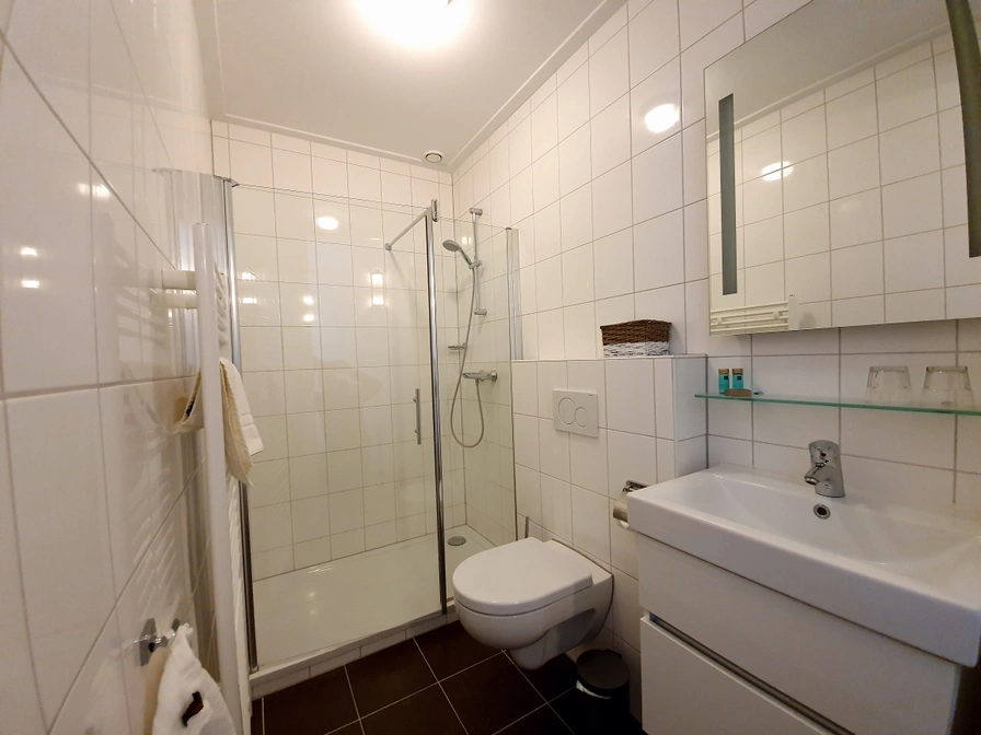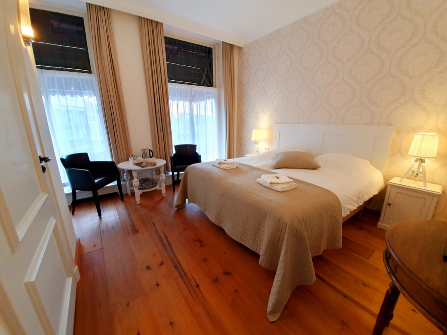 Deze lichte en comfortabele hotelkamer beschikt over een gezellige zithoek met flatscreen tv en heerlijke boxspringbedden. Er is een mooie badkamer met douche, wastafel en toilet. Ook zijn er koffie/thee faciliteiten en is er gratis WIFI verbinding.