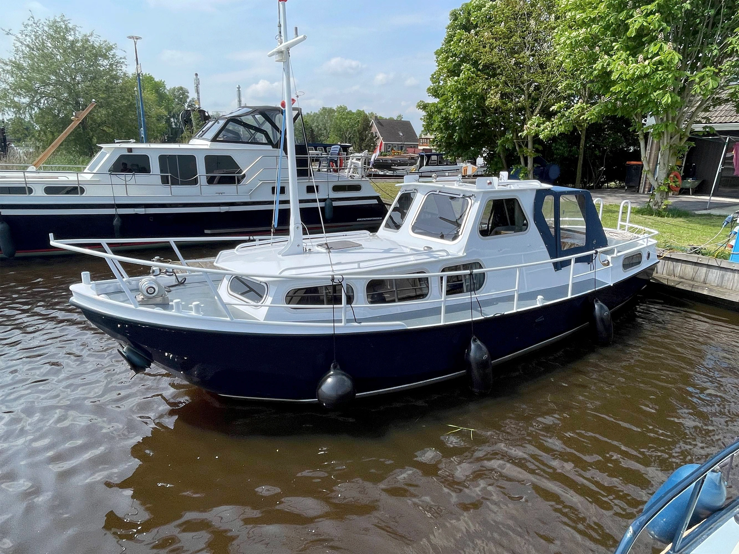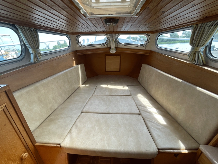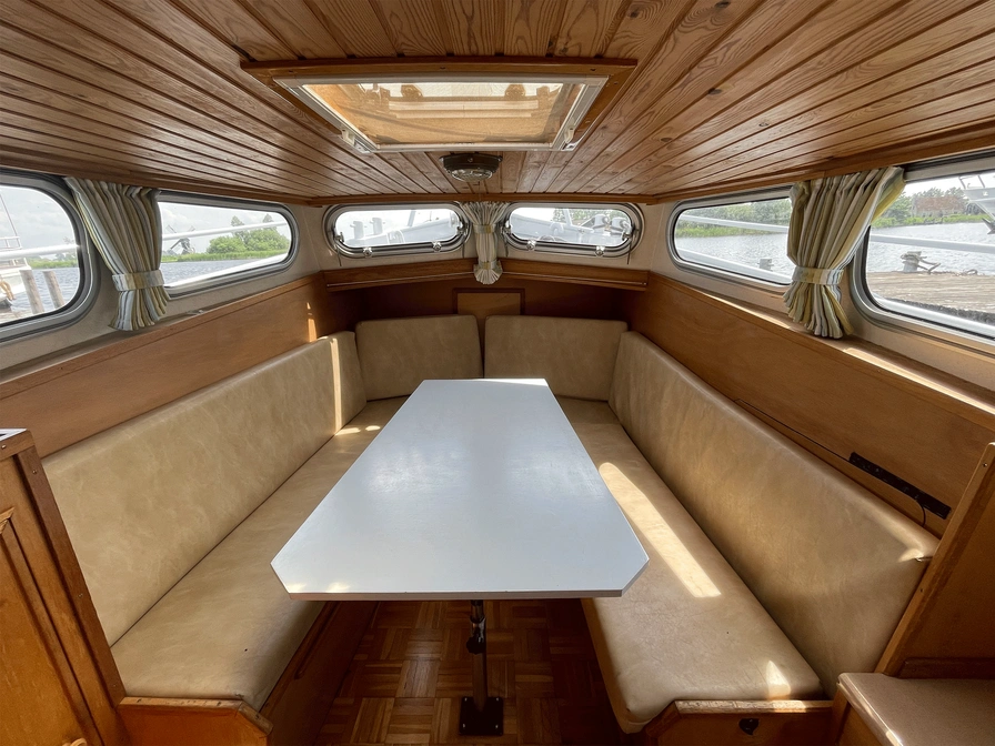 De Ouwe Peer is een compacte maar functionele boot, ideaal voor een vaarvakantie. De buitenkant is volledig geschilderd voor een frisse uitstraling, terwijl het interieur eenvoudig maar schoon en netjes is. De boot beschikt over gescheiden slaap- en leefruimtes, met 3 eenpersoonsbedden in de achterkuip. Het keukentje heeft een 2-pits gasstel en een volledige inventaris. Een grote koelbox, aangesloten op de accu, houdt eten en drinken gekoeld. Daarnaast is er een toilet aan boord. De tent op het achterdek kan worden geopend, zodat je bij goed weer volop van de zon kunt genieten.