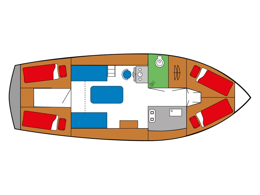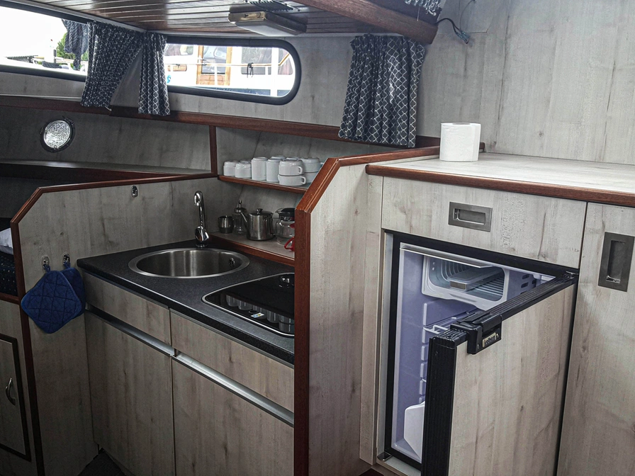 De Kempala 920 Lelie biedt een praktische indeling die perfect is voor een ontspannen vaarvakantie. Binnen vind je een gezellige salon waar je rondom kunt zitten en het uitzicht op het water kunt bewonderen. In zowel de voorkajuit als de achterkajuit bevinden zich twee eenpersoonsbedden. De keuken beschikt over een koelkast met fornuis en er is een badkamer met douche en wc.