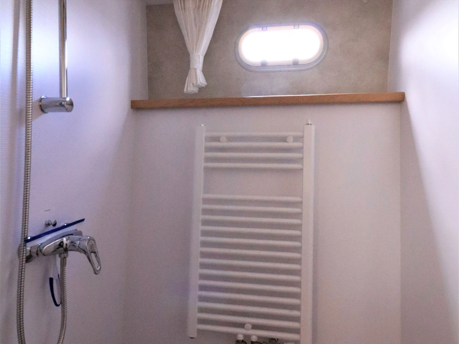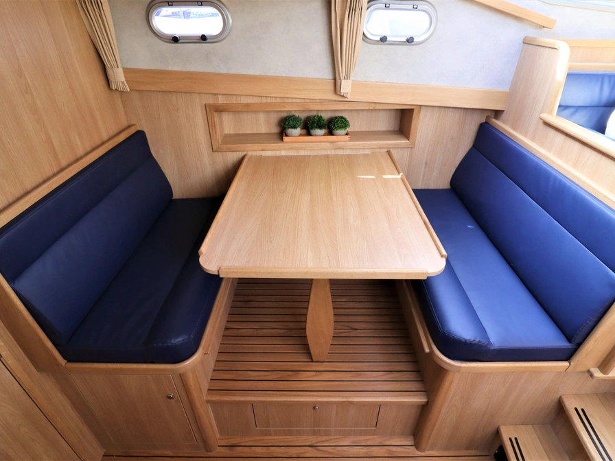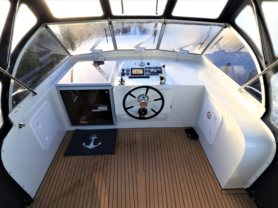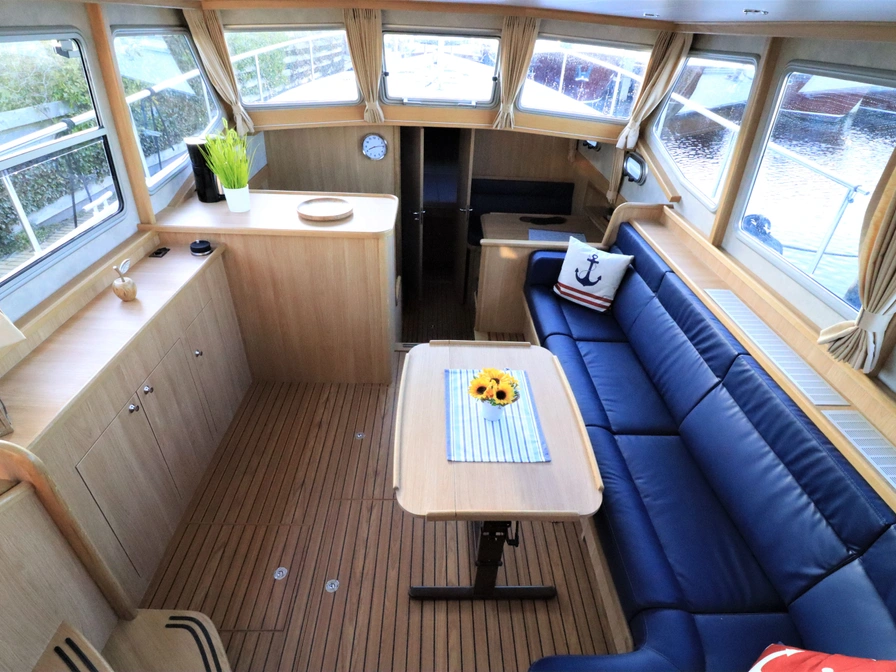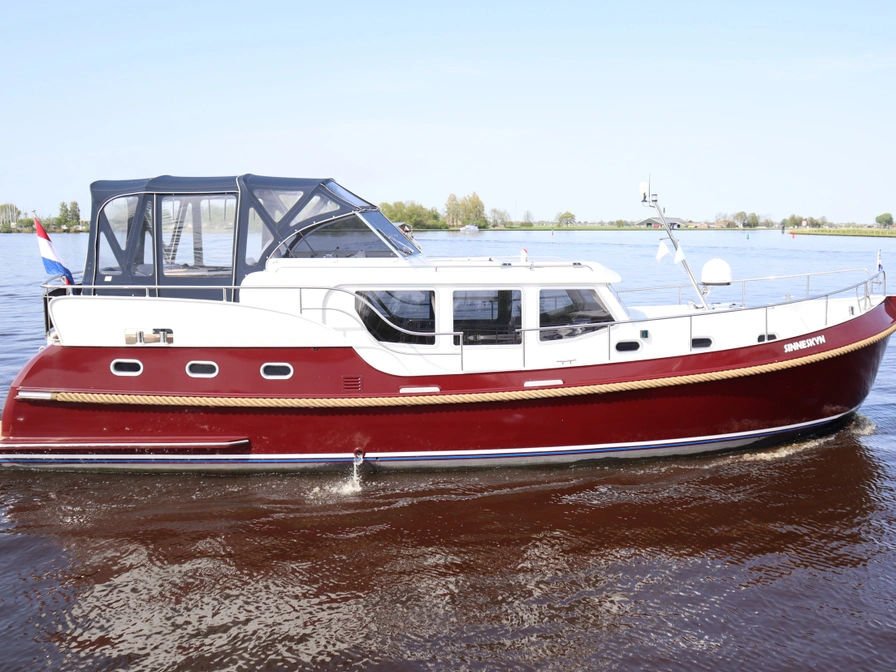 Dit klassiek gelijnde en degelijk gebouwde motorjacht uit 2021 biedt volop ruimte en comfort voor 4 personen. Dankzij de krachtige 6-cilindermotor en de boeg- én hekschroef is het schip eenvoudig te varen. Door de geringe diepgang kun je ook ondiepere wateren verkennen. Indeling: In de voorpunt vind je een comfortabel tweepersoonsbed. Aangrenzend ligt een badkamer met elektrisch toilet, wastafel en handdouche. De ruime keuken is volledig ingericht voor 4 personen en beschikt over een 3-pits gaskooktoestel met afzuiger, koelkast, combimagnetron, koffiezetapparaat én een vaatwasser. De sfeervolle salon is voorzien van een L-vormige zithoek en tv. In de achterkajuit bevindt zich een groot tweepersoonsbed. Ook hier is een tweede badkamer aanwezig met elektrisch toilet, wastafel en een separate douche. Het schip is uitgerust met dubbel glas voor extra comfort. Op het ruime zonnedek vind je een vaste U-bank, een XL-cabriotent, windscherm, zonnepaneel en een stuurstand met GPS-kaartplotter. Via een geïntegreerde wenteltrap met led-verlichting bereik je het zwemplateau met zwemtrap. Kortom: een compleet en comfortabel schip voor een ontspannen vaarvakantie. Let op: heb je nog geen vaarervaring? Dan is een vaarinstructie verplicht.