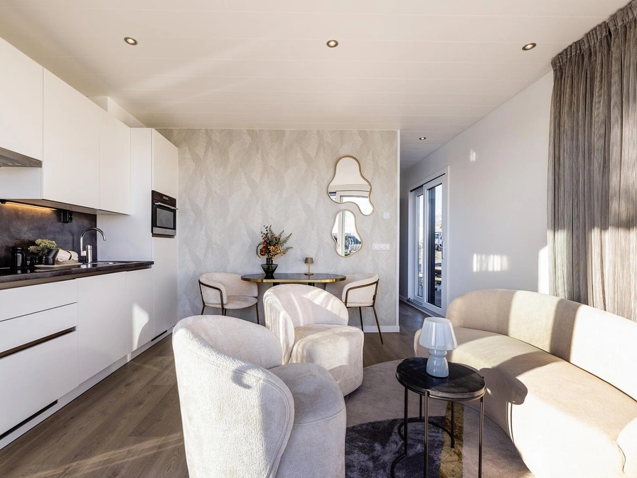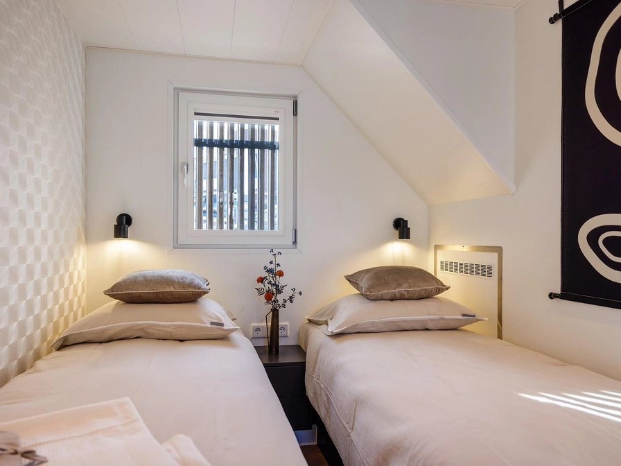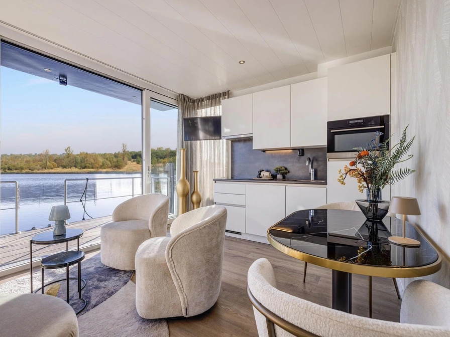 Overnacht op een luxe houseboat in Lemmer aan het IJsselmeer. Je verblijft op het water met alle comfort van een modern vakantiehuis. De houseboat ligt rustig in de haven van Lemmer en kijkt uit over het water. Binnen is het licht en praktisch ingericht. De woonruimte heeft een comfortabele zithoek en een eettafel voor vier personen. De keuken is volledig ingericht en voorzien van een vaatwasser. Verder zijn er twee slaapkamers, waarvan één met een tweepersoonsbed. Buiten geniet je van een ruim terras direct aan het water en een dakterras waar je de hele dag kunt zitten. Er is een BBQ aanwezig zodat je ook buiten kunt eten.