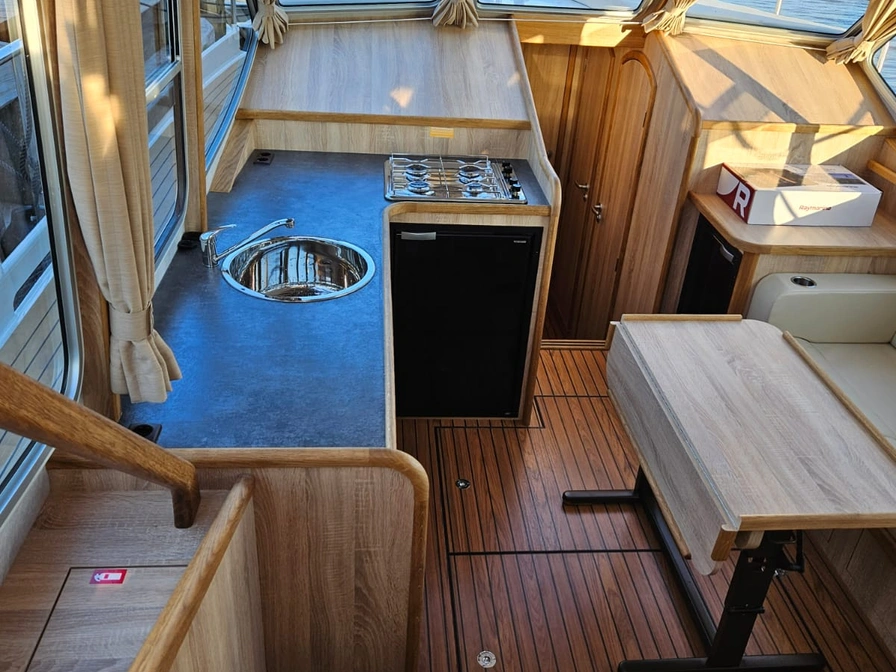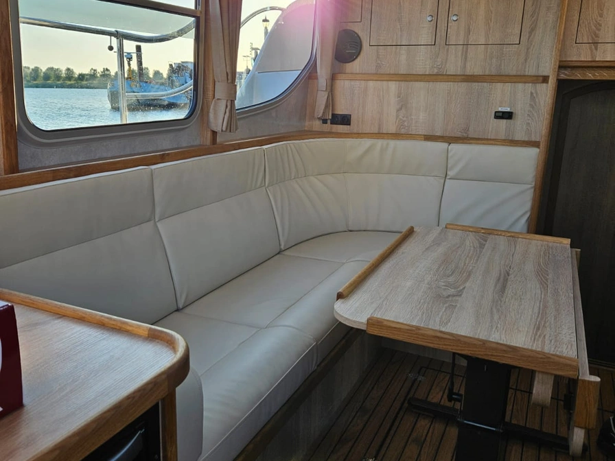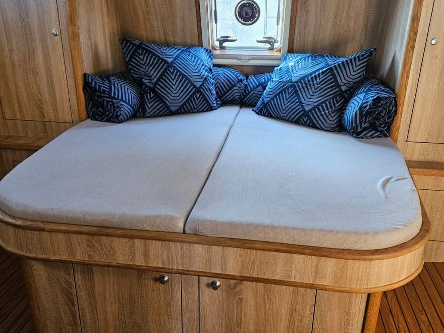 Stap aan boord van de ruime Gruno 41 en geniet van comfort en vrijheid op het water. Dit stalen motorjacht heeft drie hutten met zes vaste slaapplaatsen en twee badkamers met douche en toilet. Binnen voelt het licht en ruim en er is veel plek om spullen op te bergen. Op het grote achterdek met ronde zitgroep zit je samen comfortabel en via de trap loop je zo naar het zwemplateau. Met boeg en hekschroef vaar je makkelijk en dankzij de touchscreen kaartplotter en muggenhorren is het schip van alle gemakken voorzien. Voor het reserveren van deze boot dien je rechtstreeks contact op te nemen met de verhuurder.