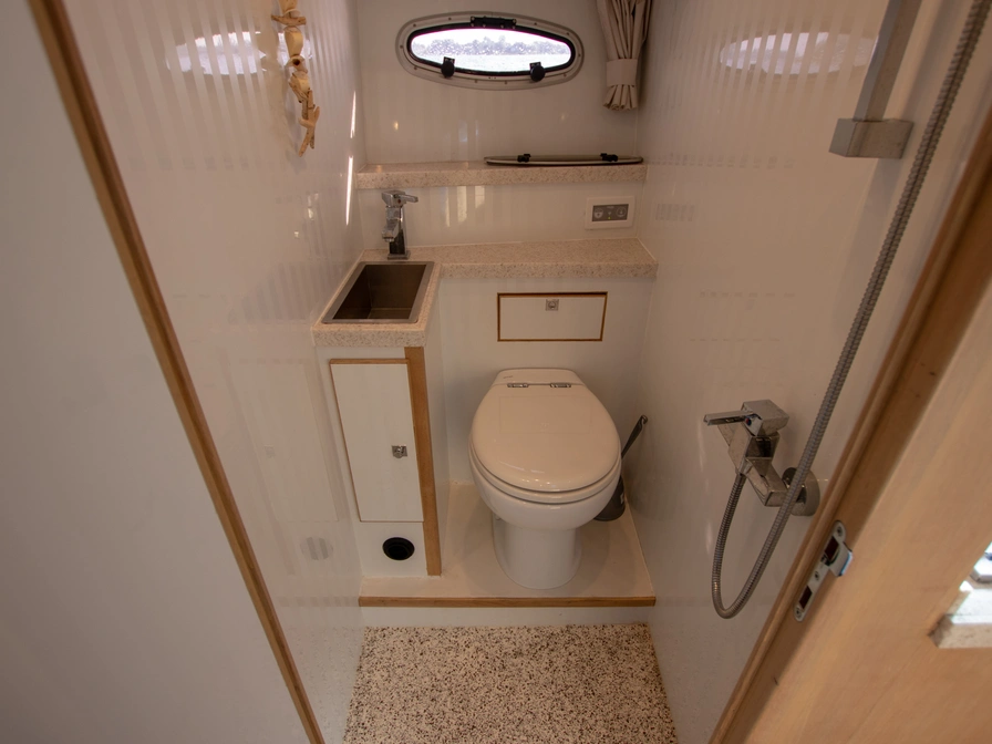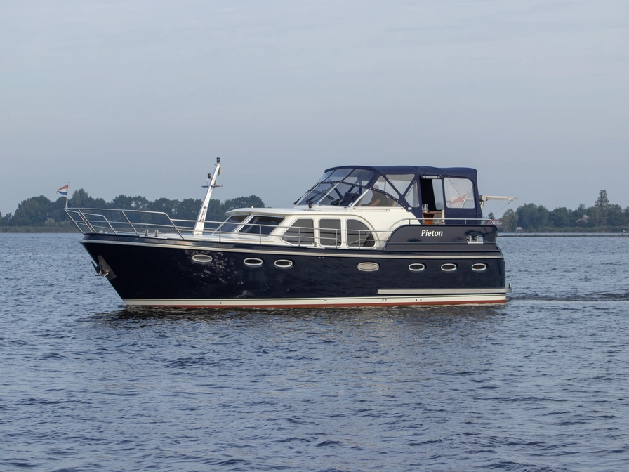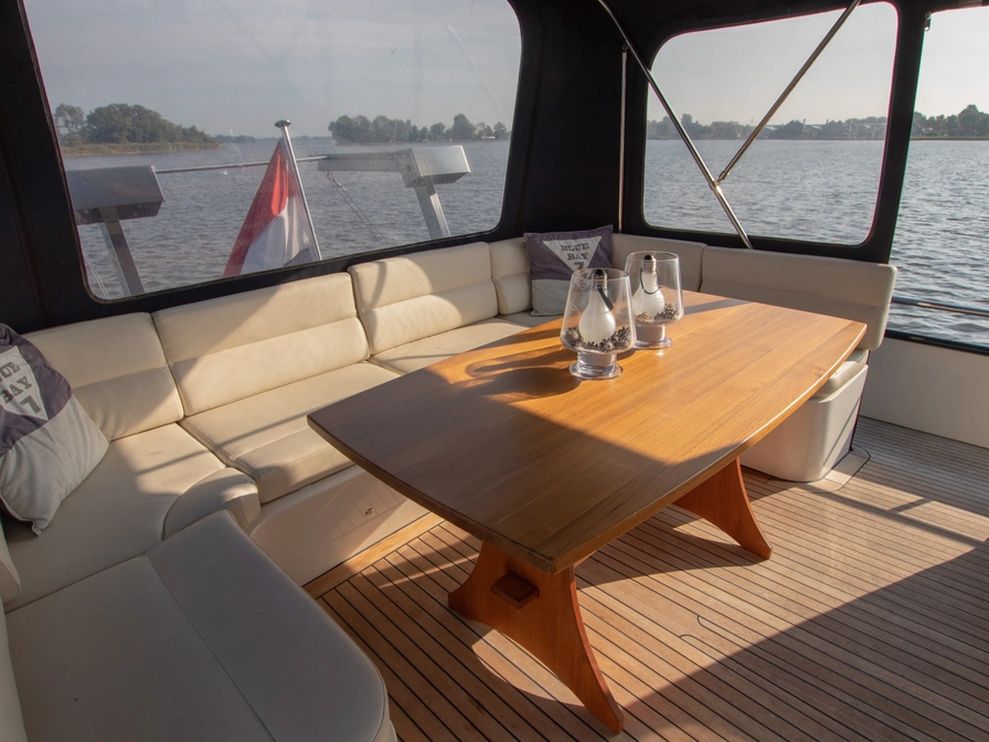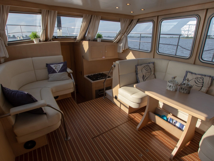 Dit luxe motorjacht is van alle gemakken voorzien! Boven op het achterdek vind je de besturing van het jacht. Met dank aan de tent zit je altijd droog en beschut en door de hoge zit boven de boot heb je een ruim overzicht over het water. Met behulp van de boeg- en hekschroef kun je makkelijk manoeuvreren of aanmeren in een haven. Ook het interieur van dit motorjacht is ruim opgezet met een grote salon en ruime keuken met oven, gaskookplaat en koelkast. Er zijn vier hutten (slaapkamers) die elk geschikt zijn voor twee personen. Daarnaast is er in de salon nog een negende slaapplaats te realiseren op de bank. Tevens vind je aan boord twee toiletten, evenals twee douches. Een van deze douches is gesitueerd in de toiletruimte.
