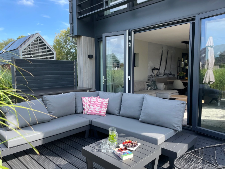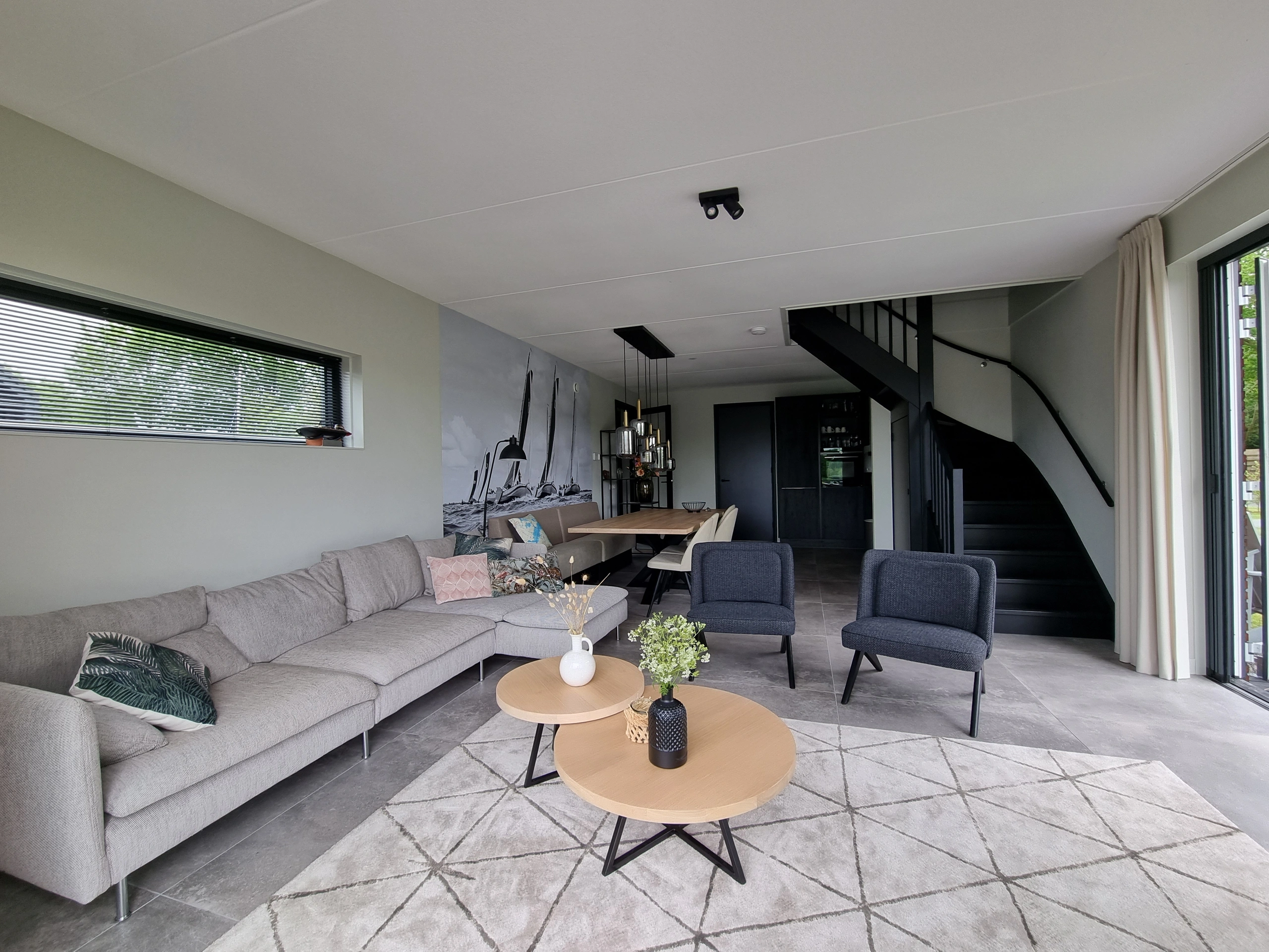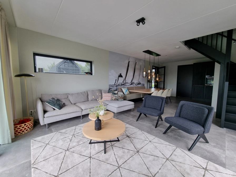Welkom in deze duurzame eigentijdse villa aan het water, hier kun je optimaal genieten van een heerlijke vakantie! Nadat je auto geparkeerd is en je door de voordeur naar binnen bent gelopen, stap je na de hal meteen de sfeervolle keuken binnen. Je zult zien dat deze van alle gemakken is voorzien en dat je heerlijk kunt gaan koken. Als je even verder loopt, is daar al de fijne, gezellige woonkamer met prachtig zicht op het water! Het terras buiten is ruim, met genoeg plek om buiten van het zonnetje te genieten. Tevens heb je een eigen aanlegplaats voor een boot. Achter de keuken is de eerste slaapkamer, met een eigen douchegelegenheid. Boven bevinden zich drie slaapkamers. Twee met een tweepersoons boxspring-bed en een met een stapelbed; de perfecte kinderkamer. Een van de slaapkamers boven heeft een eigen badkamer, de andere twee delen een badkamer. - Goed om te weten, de tuin is omheind.
