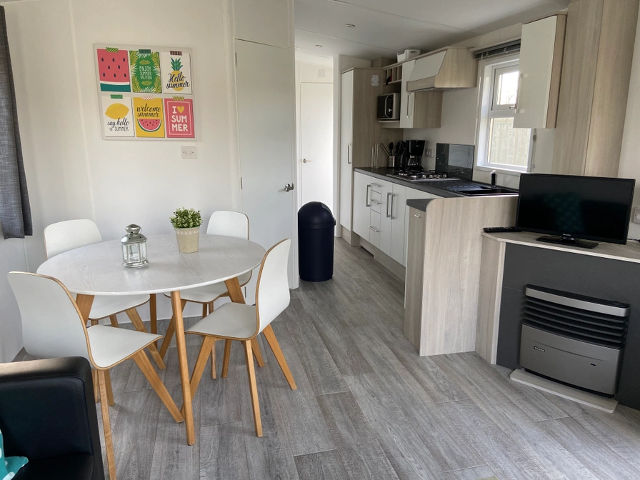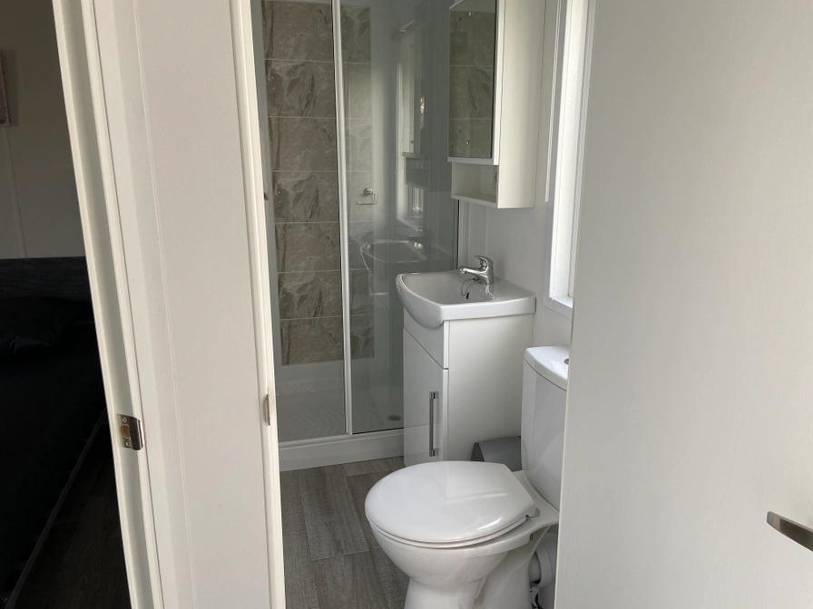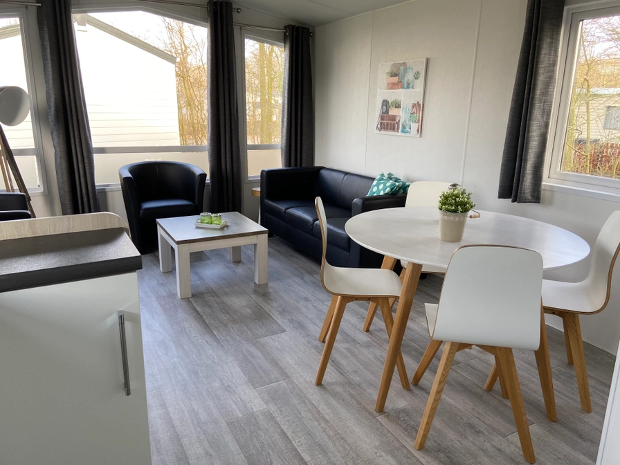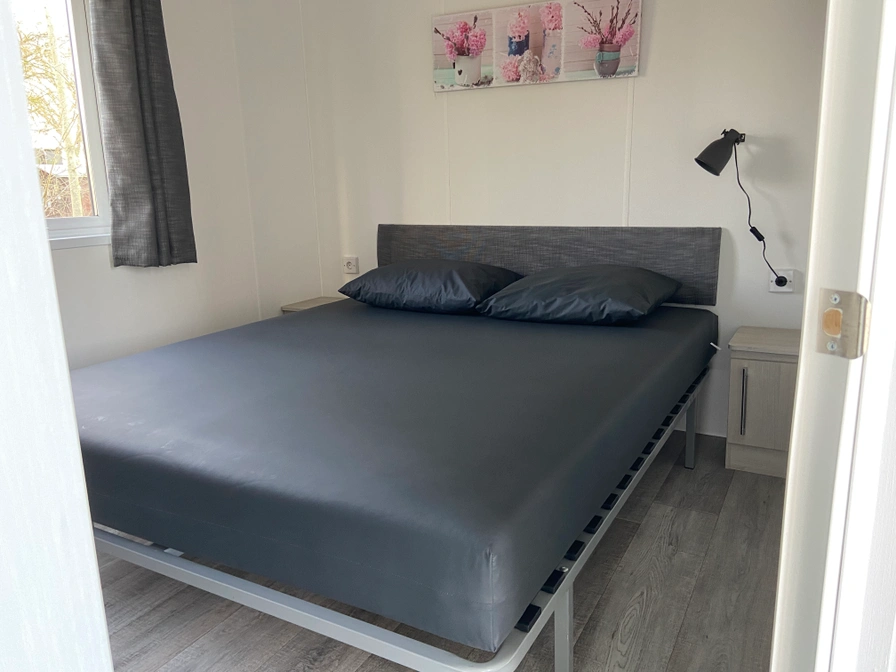 Dit chalet beschikt over een woonkamer met open keuken. Er zijn twee slaapkamers, één met twee eenpersoonsbedden en één met een tweepersoonsbed. De badkamer heeft een douche, toilet en wastafel. Buiten is er een eigen terras met meubilair en een parkeerplaats. Voor het reserveren van een chalet op deze camping dien je rechtstreeks contact op te nemen met deze camping.