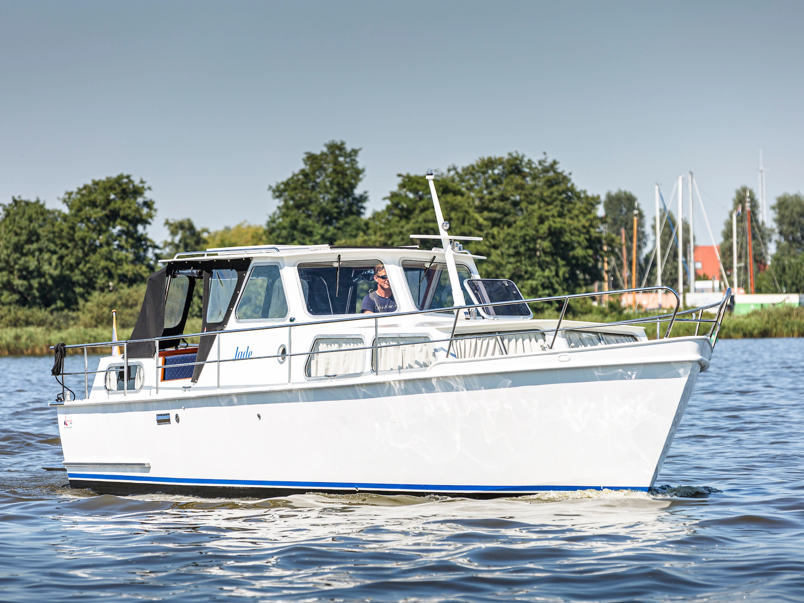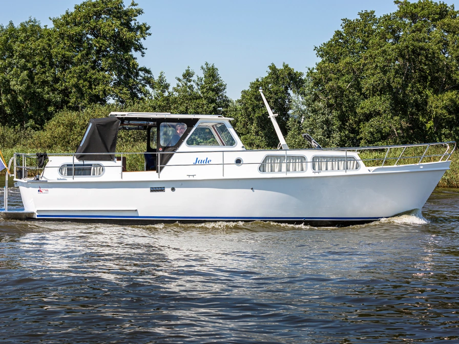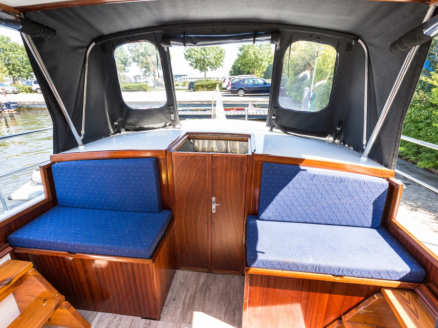 De Harderwijk Kruiser 10.50 AK is een heerlijk familieschip met een ruime achterkajuit. De kuip is voorzien van een overdekte stuurhut met schuifdak zodat u zich bij mooi zomerweer toch buiten waant. De zijkant en achterzijde van de stuurhut kan worden afgedekt met een tent (met ramen) zodat je bij iets minder mooi weer toch comfortabel kunt varen.