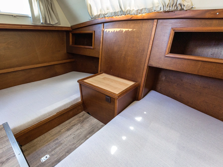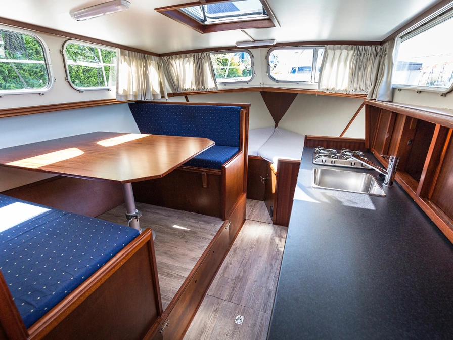 De sfeervolle kajuit is van alle gemakken voorzien. Keuken met gasfornuis, spoelbak met warm en koud water en koelkast. Het toilet is een apart afgesloten ruimte inclusief kleine wasbak met handdouche. Aan de dinette kan men met 4 personen ruim zitten. De tafel kan worden ingeklapt zodat de dinette kan worden omgebouwd tot tweepersoonsbed (2,20 x 1,40 m.). De punt van de boot is voorzien van een tweepersoonsbed in V-vorm (2,00 x 1,60 m.). Via een trapje in de stuurhut komt men in de ruime achterkajuit welke geschikt is als slaapplaats voor 2 personen (2x 1-pers. bed).