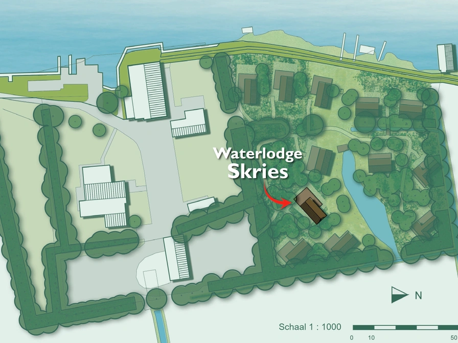 Skries (NL: Grutto) is een heerlijke waterlodge met twee ruime terrassen waardoor je van 's ochtends vroeg tot 's avonds laat kunt genieten van de omgeving en de prachtige uitzichten. Er is een ruim opgezette leefruimte met een grote eettafel voor acht personen en een comfortabele zithoek met houtkachel. De keuken bevindt zich eveneens in de leefruimte en is voldoende uitgerust voor acht personen. Skries beschikt over drie slaapkamers waarvan een een vast tweepersoonsbed heeft, de andere twee eenpersoonsbedden en de derde slaapkamer heeft een dubbel stapelbed. De bedden zijn voorzien van kussens en dekbedden. Beddengoed kun je huren, maar ook zelf meenemen. De waterlodge beschikt over een badkamer met ruimte douche, dubbele wastafel en toilet. Voor extra gemak is er een tweede toilet in de waterlodge.