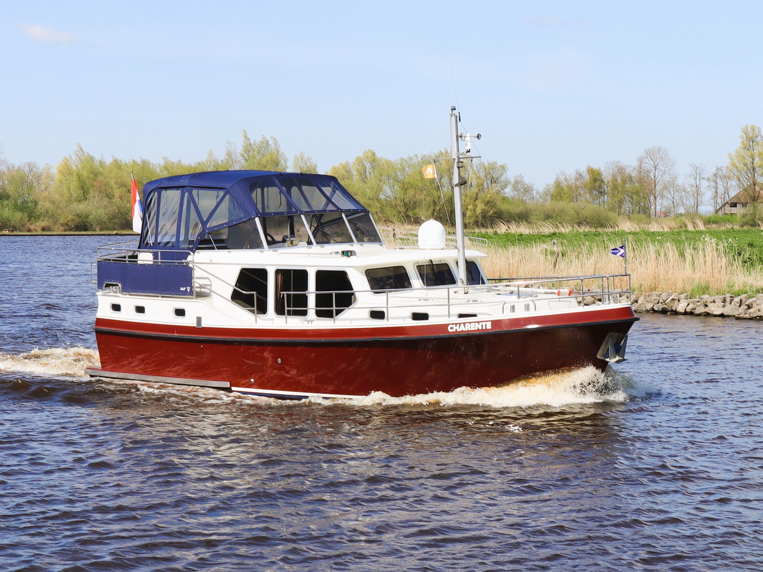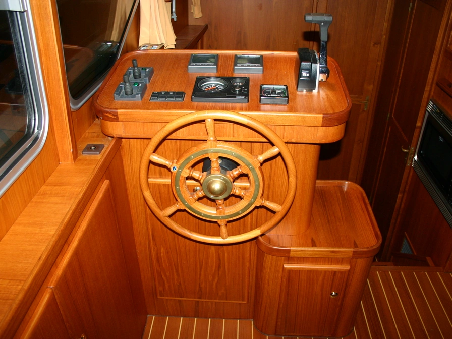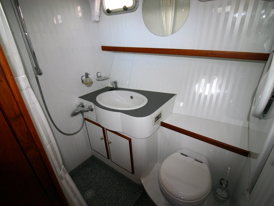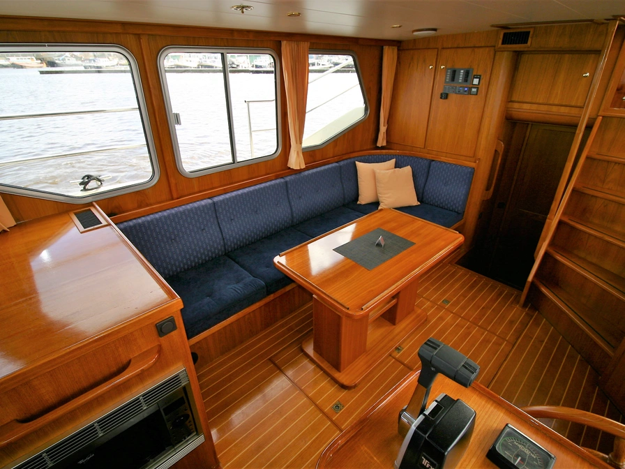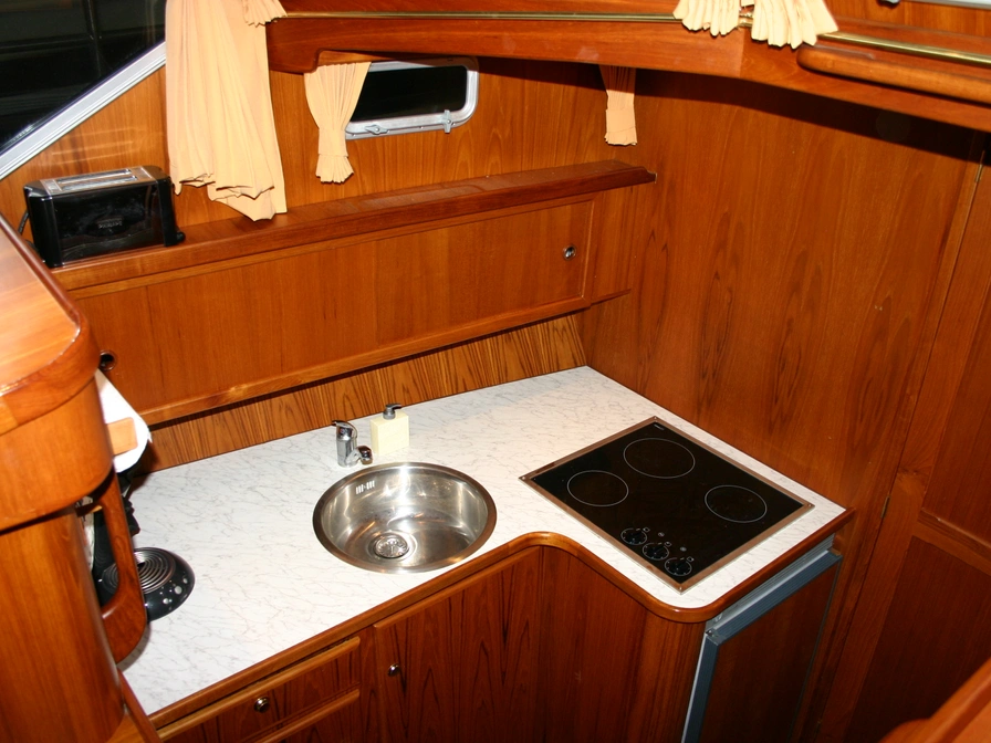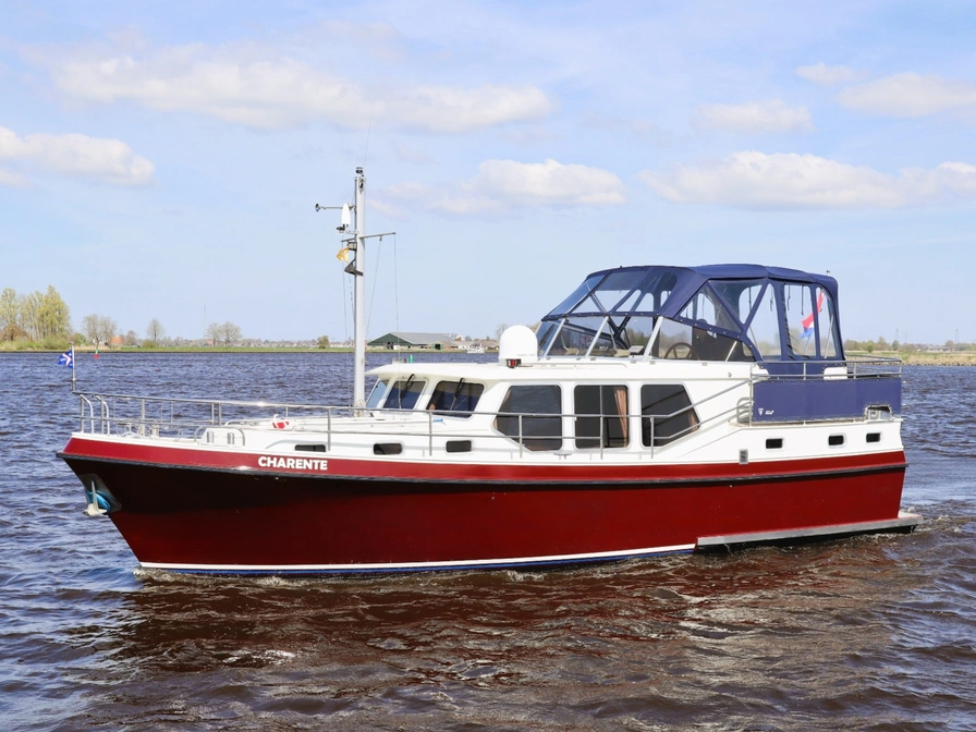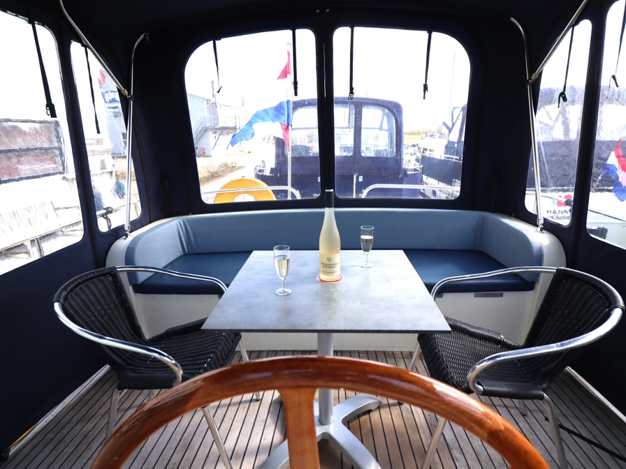 Dit klassiek gelijnde en degelijk gebouwde motorjacht biedt veel ruimte en comfort voor 4 personen. Dankzij de krachtige 106 PK Deutz-motor en de boeg- én hekschroef is het schip gemakkelijk te varen. Door de geringe diepgang kun je ook ondiepere wateren verkennen. Indeling: Voorin bevinden zich twee eenpersoonsbedden met lattenbodem in V-vorm, die je met een tussenstuk eenvoudig ombouwt tot een tweepersoonsbed. Direct daarnaast vind je een ruime badkamer met elektrisch toilet, wastafel, douche en een was/droogcombinatie. De keuken is volledig uitgerust voor 4 personen, met een 3-pits keramisch kooktoestel met afzuiger, koelkast, combimagnetron en koffiezetapparaat. In de sfeervolle salon geniet je van een L-vormige zithoek en een televisie. In de achterkajuit slaap je comfortabel in een groot tweepersoonsbed met lattenbodem. Ook hier is een ruime badkamer met elektrisch toilet, wastafel en een royale douche. Het schip is voorzien van airconditioning en dubbel glas. Op het ruime, met teak beklede zonnedek vind je een XL-cabriotent, vaste zitbank, windscherm, zonnepaneel, tweede stuurstand met GPS-kaartplotter en een dekwaspomp. Het zwemplateau beschikt over een zwemtrap en buitendouche. Een zeer compleet schip voor de vakantieganger die houdt van comfort en gemak. Let op: heb je nog geen vaarervaring? Dan is een vaarinstructie verplicht.