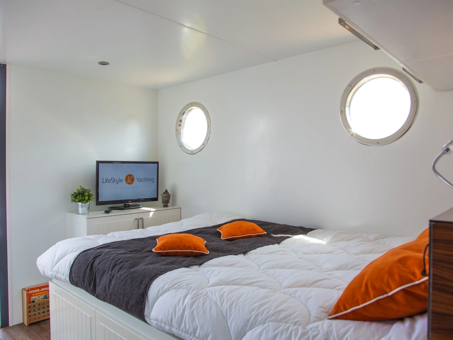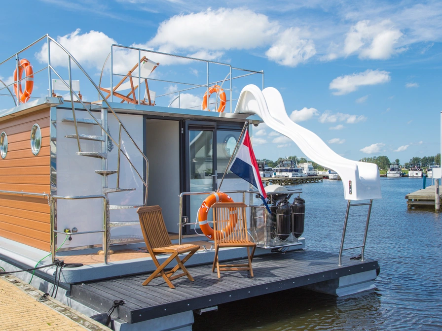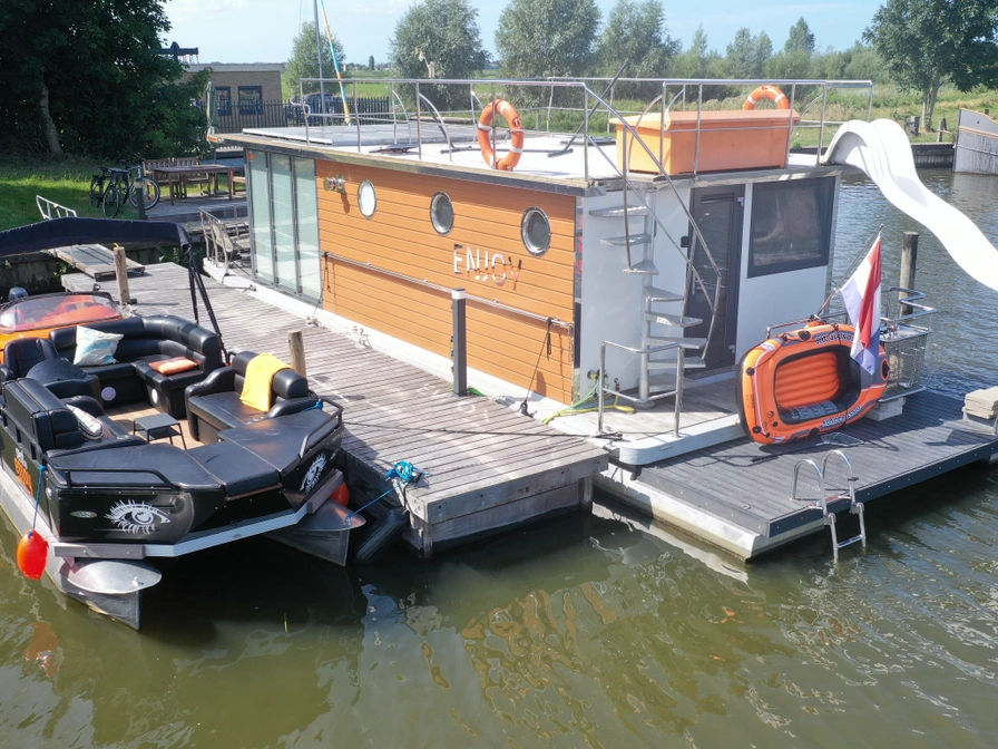 Uniek overnachten op het water! Dat is wat je van Houseboat Enjoy kunt verwachten, de naam verklapt het al, het is een vakantiewoning niet aan het water, maar óp het water! Romantisch met z'n tweeën of met het gezin, het kan bij deze houseboat allemaal. De woonkamer heeft ramen en openslaande deuren van grond tot plafond, zodat je optimaal kunt genieten van de omgeving. Je kunt buiten plaatsnemen op het terras naast de woonkamer of op het dakterras bovenop de houseboat! Binnen vind je verder twee slaapkamers met comfortabele bedden en een compleet uitgeruste badkamer. De keuken is klein, maar voldoet voor een aantal dagen prima. Ga je buiten eten of binnen aan de eettafel? Je kunt alle kanten op!