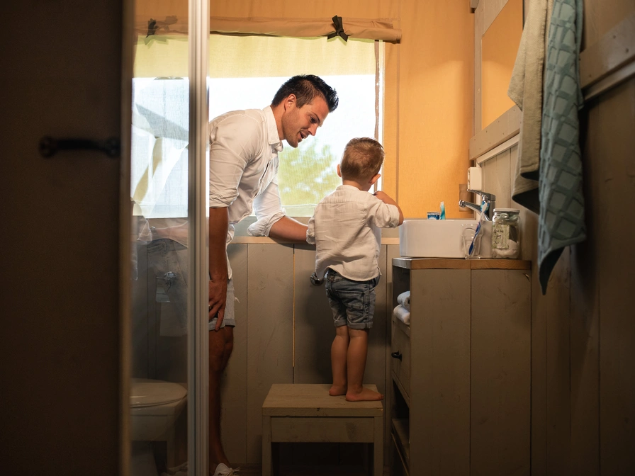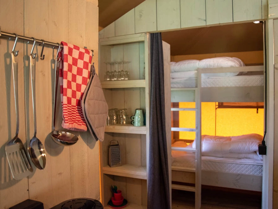 In de safaritent is een steil trapje, waarmee je de bedstee kunt bereiken. Standaard bij je verblijf wordt het bedlinnen geleverd en een servicepakket met daarin een vaatdoek, dweil, afwasborstel, 2x vaatwastablet, lucifer, vuilniszak en wc rol.