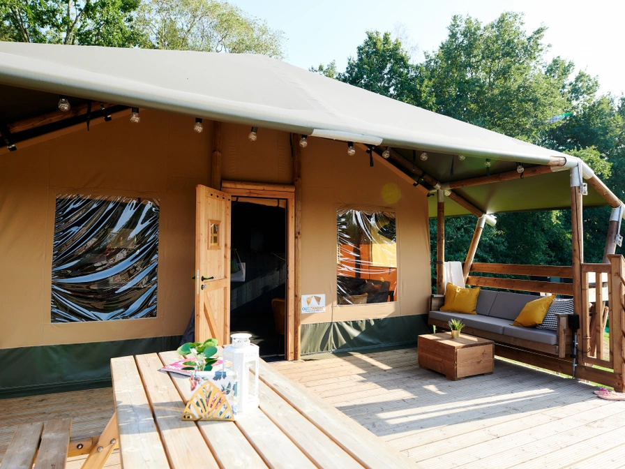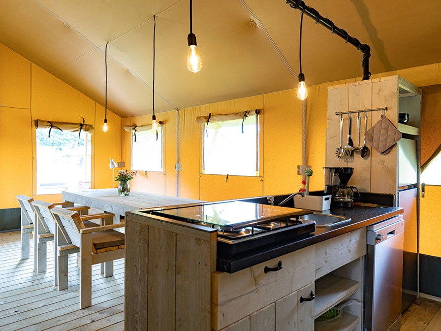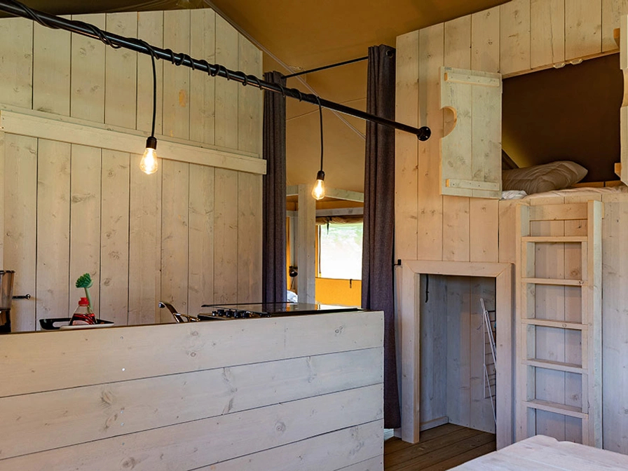 Deze stoere luxe safaritent staat op een kleinschalige gezinscamping met verwarmd openlucht zwembad. Hier kun je heerlijk genieten van het buitenleven en gezelligheid met het nodige comfort en een vleugje luxe. Via een houten vlonder terras met daarop een heerlijke lounge set stap je de safaritent binnen en zie je meteen hoeveel ruimte je hebt. In de open ruimte staat een grote tafel met plaats voor zes personen en een complete, uitgeruste keuken, met zelfs een vaatwasser. Van alle gemakken voorzien! In de badkamer vind je alles wat je nodig hebt; een douche, een wastafel met spiegel en toilet. Er zijn drie slaapkamers in de safaritent, een daarvan is de 'ouderslaapkamer' en heeft een tweepersoonsbed. Daarnaast is er nog een slaapkamer met een stapelbed, maar de leukste slaapplaats is misschien wel de bedstee! Je klimt met een trappetje naar boven en vindt hier nog een slaapruimte. Mocht het wat kouder worden, dan kun je de kachel aanzetten en wordt het snel warm in de tent. Optimaal genieten van het buitenleven, slapen onder tentdoek en toch alle comfort en een vleugje luxe!