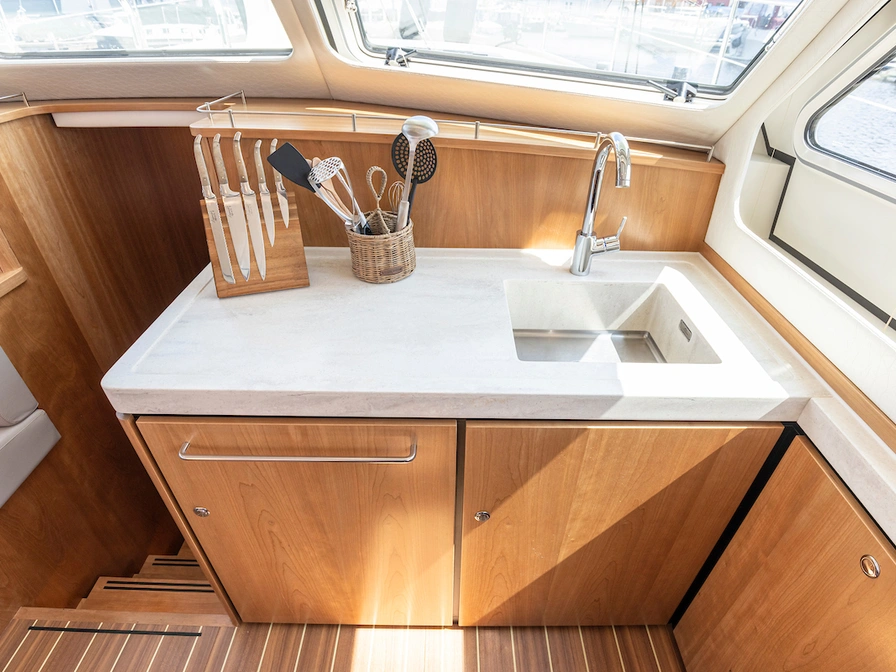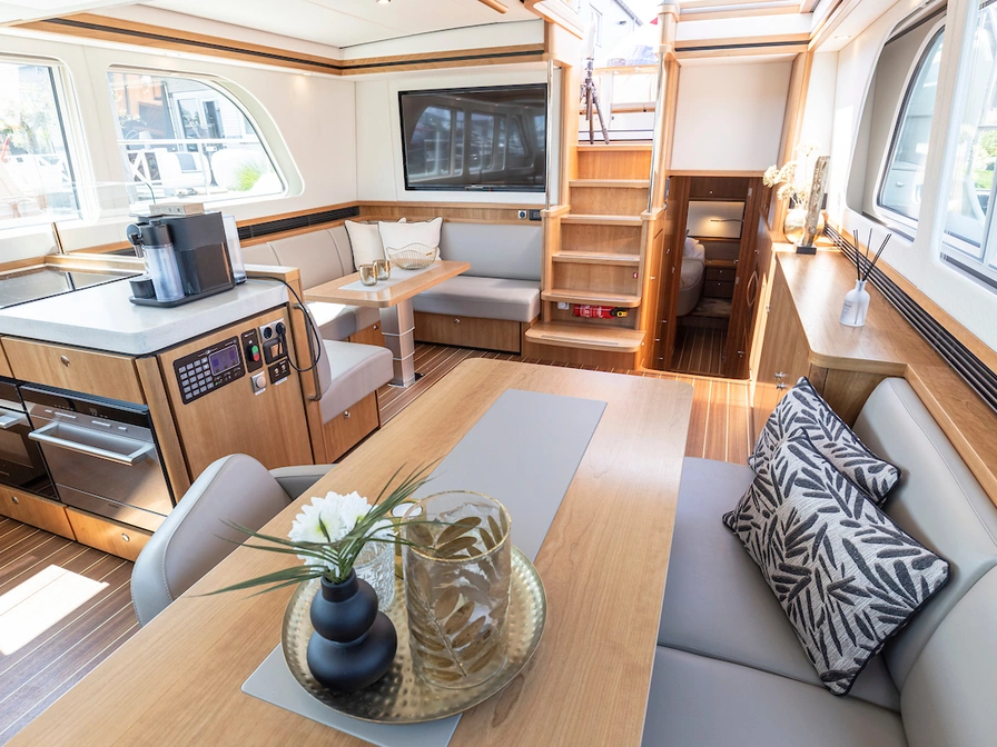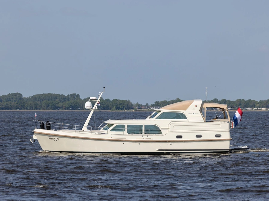 De fameuze 500 Variotop in complete zee-uitrusting Het topmodel van Linssen Yachts met alle luxe opties inclusief stabilisatoren en airco. In Friesland exclusief te huur bij Sanzi Yacht Charter. Droomschip om uw vakantie op door te brengen. Zeer geschikt voor zowel binnenwateren als zee. Zeer chique jacht. Dit nieuwe jacht is zeer compleet uitgevoerd voor zowel binnenwateren als zee. De stabilisatoren zorgen voor perfecte stabilisatie op onrustig water, wat een ongeacht het weertype een rustige reis garandeerd. In het stuurhuis is het dashboard voorzien van alle denkbare navigatietools en boven de stuurbank is de Variotop welke elektrisch bedienbaar is. In het stuurhuis is ruim zitplaats en tevens is daar een klein keukentje met een extra koelkast. Dit gedeelte van het het schip is geheel afsluitbaar met solide deuren en verwarmbaar. Verder is op het achterdek een royale zitbank met een in hoogte verstelbare tafel welke eenvoudig tot een loungebed te maken is.. Ook dit deel, het achterdek, is geheel afsluitbaar met een cabriokap( staat niet op de foto's) Het badplatform is verlengd en is verzinkbaar, zodat het zwemmen nog een groter plezier wordt! De indeling is uitermate geschikt voor 4-6 +2 personen. Benedendeks zijn drie royale 2-persoons slaaphutten, twee badkamers, twee toiletten. De salonbank is met een handeling in te richten als een extra twee-persoonsbed. De Tartufi is uitgerust met een comfortabele centrale verwarming en zelf met een airco-systeem, zodat het met elke temperatuur prettig verblijven is aan boord. Een compleet uitgeruste keuken, met combi-oven, vaatwasser, inductiekookplaat en een Nespresso koffiemachine met melkfunctie maken de luxe beleving compleet.