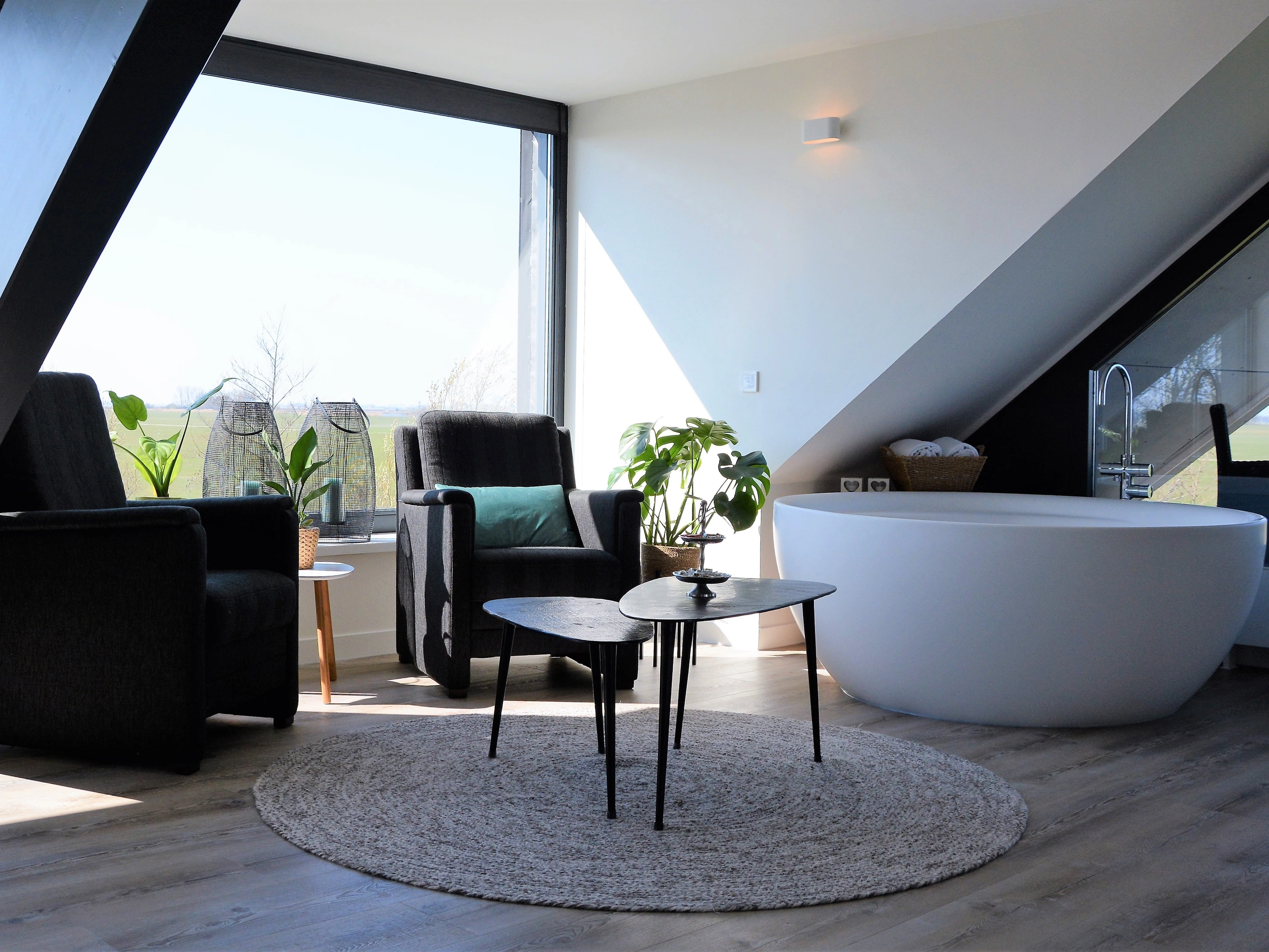 U verblijft op de eerste verdieping en daardoor heeft u vanuit de suite een prachtig panorama uitzicht over de landerijen. De suite is een vrijstaande en duurzame accommodatie voor twee personen welke als een loft is ingericht. Het leent zich bij uitstek voor een bijzonder nachtje of luxe weekendje weg. De compleet ingerichte open keuken beschikt over onder andere een koelkast, oven, vaatwasser, Dolce Gusto koffiemachine met cups en Quooker. Er staat een eettafel met zes stoelen. Aangrenzend is de living met twee heerlijke fauteuils, een smart tv, balkon met zitje en ligbed en een vrijstaand ligbad! De gehele suite beschikt over meerdere grote raampartijen voor heerlijk lichtinval en prachtig uitzicht, maar biedt toch volop privacy. Het slaapgedeelte beschikt over een kingsize boxspringbed. De badkamer heeft een dubbele regendouche, wastafel, apart toilet en beschikt over Rituals producten en zacht wit badlinnen en badjassen. De suite is zeer geschikt voor speciale gelegenheden.