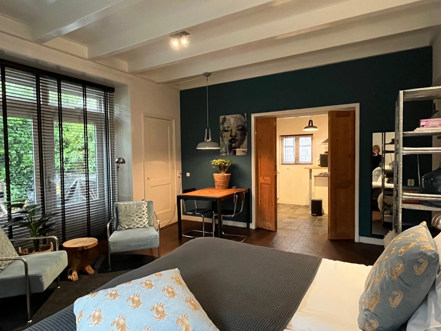 De Tuinkamer is gelegen op de begane grond. De kamer is te bereiken via de poort naar de stadstuin. Het heeft een karaktervolle ruime zit-/slaapkamer met openslaande tuindeuren en toegang tot je eigen privé terras met loungebank en houtkachel. De kamer beschikt over een badkamer met regendouche, apart toilet en een goed uitgeruste eigenwijze keuken, met onder andere een koffiemachine, vaatwasser, koelkast en magnetron. Tevens is er een moderne TV met Netflix en (eigen) WiFi.