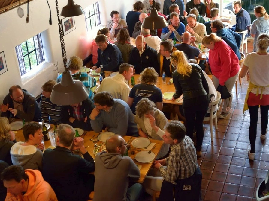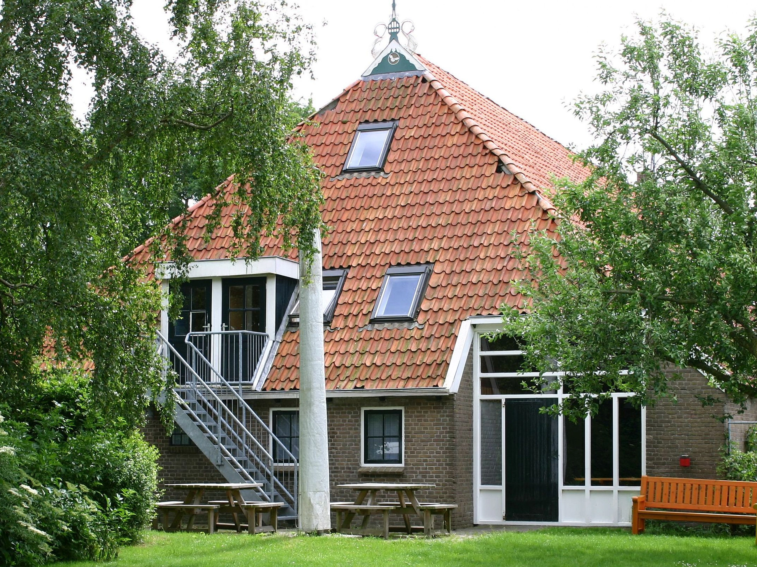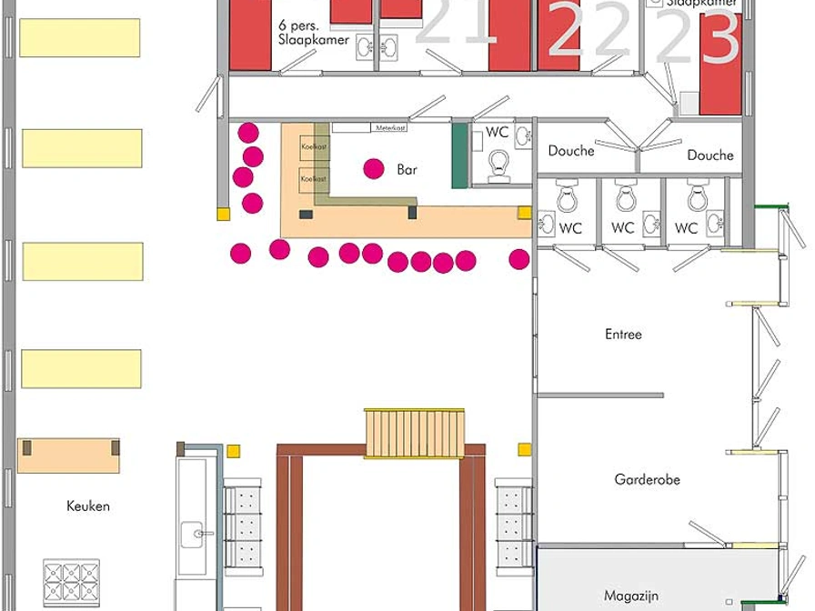 Welkom bij onze accommodatie! Stap binnen in onze gastvrije entree, compleet met toiletten, garderobe en handige opslagruimte voor zeilpakken en zwemvesten. De verblijfsruimte nodigt uit met een gezellige zithoek, omringd door comfortabele houten banken, een sfeervolle bar en een ruime eethoek. Achter de bar bevinden zich vier slaapkamers, twee douches en een extra toilet. De open keuken is volledig uitgerust met moderne voorzieningen, waaronder een zes-pits fornuis met oven, een professionele vaatwasser, een magnetron en koffiezetapparaat. Voor extra gemak is er een apart magazijn met twee koelkasten en een vriezer. Buiten kunt u ontspannen op het terras en genieten van het speelveld achter de boerderij. Op de eerste verdieping verwelkomt een balustrade u met twee tweepersoons slaapkamers, een douche, twee toiletten, twee zespersoons kamers en een vijf-persoons kamer, evenals twee extra douches. Een gang leidt naar een vier- en een tweepersoons kamer, een douche en toilet. Bovendien vindt u hier een vijf-persoons kamer met eigen douche en toilet. Op de tweede verdieping bevindt zich een vijf-persoons kamer met douche en toilet.