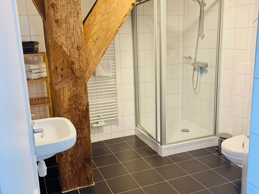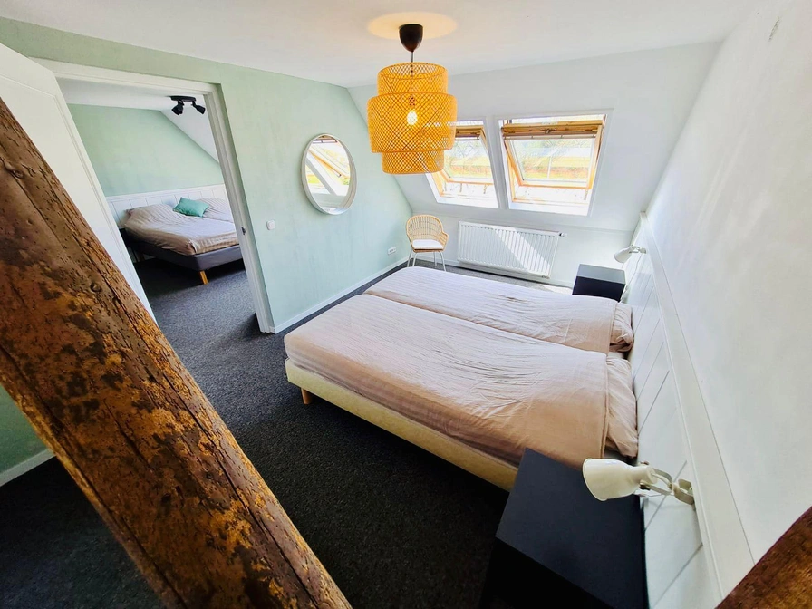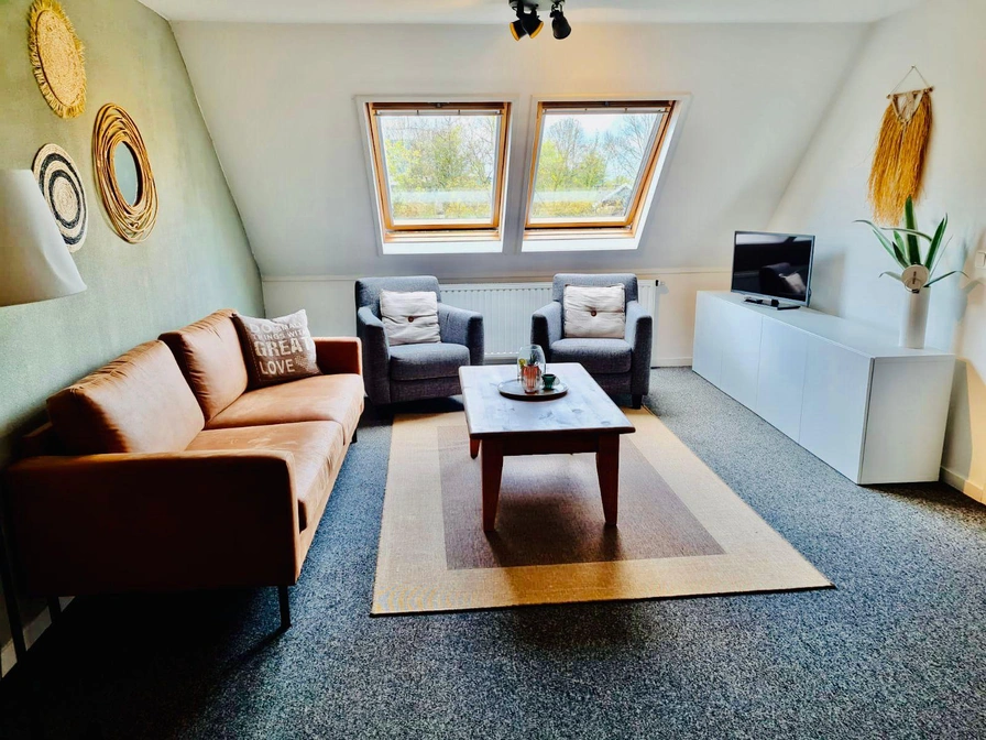 Het appartement op de eerste verdieping, direct onder de enorme kap van de boerderij, is geschikt voor 2-5 personen. Er is een ruime, sfeervol ingerichte woonkamer met open keuken, slaapkamer met één tweepersoonsbed en één eenpersoonsbed. In de woonkamer staat een comfortabele tweepersoonsslaapbank. De keuken is van alle benodigde inbouwapparatuur voorzien zoals een vaatwasser en oven, koelkast met vriesvak, inductiekookplaat etc. Televisie is aanwezig en wifi is gratis.