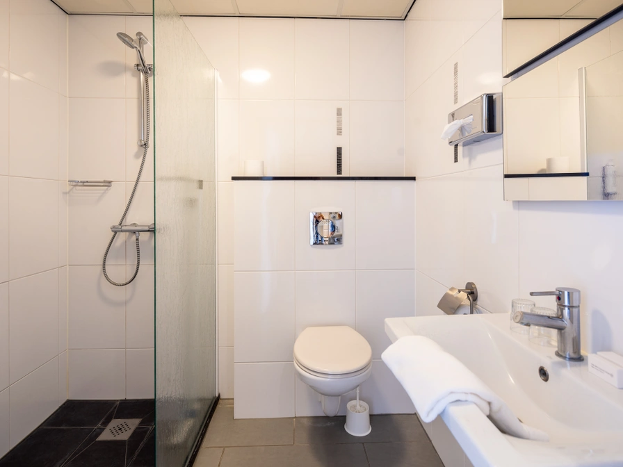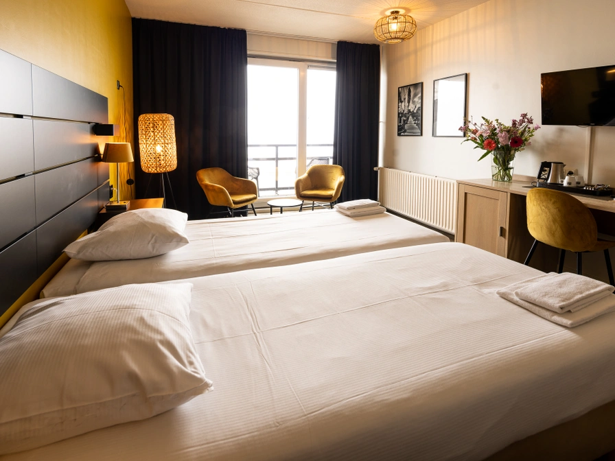 De Zuiderzeezicht kamer heeft een prachtig uitzicht over de voormalige Zuiderzee, tegenwoordig IJsselmeer. De kamers zijn zowel op de begane grond als op de eerste en tweede etage gelegen. De kamers op de begane grond beschikken over een eigen terras en de kamers op de eerste en tweede etage hebben een balkon. De kamer is voorzien van twee comfortabele eenpersoons boxspringbedden, een zitje, bureau en televisie, evenals koffie- en theefaciliteiten. De badkamer beschikt over een douche, toilet, wastafel en föhn.