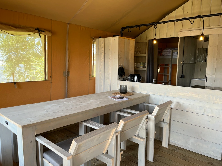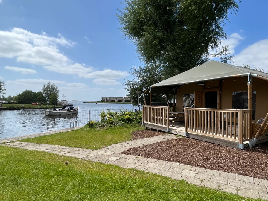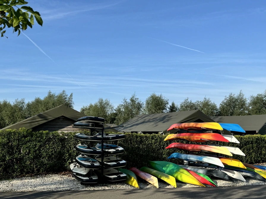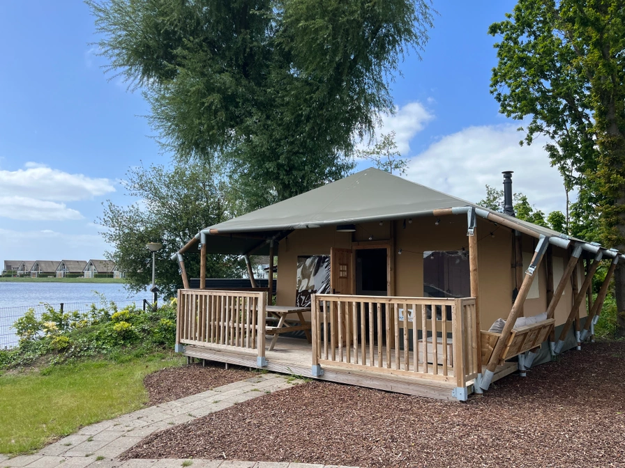 Het terrein waarop deze tenten staan is zo ingericht dat elke glampingtent uitzicht heeft op het speelveld. Op deze manier kan iedereen relaxed plaatsnemen op de loungebank op de veranda, terwijl de kinderen spelen in de speeltuin of een duik nemen in het Heegermeer.