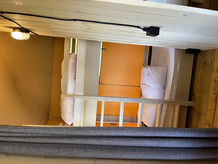 Geniet van een heerlijke vakantie in deze ruime luxe zespersoons glampingtent. De tent beschikt over maar liefst 3 aparte slaapruimtes! Zo vind je er twee slaapkamers, waarvan een met een tweepersoonsbed en een met een stapelbed. Daarnaast is er ook nog een bedstee waar je een tweepersoonsbed in vindt, helemaal leuk voor de kinderen! Je hebt een eigen badkamer met onder andere en douche en toilet. In de tent is eveneens een compleet ingerichte keuken met vaatwasser. De keuken is gesitueerd in een open ruimte waar ook een eettafel met plek voor zes personen is en een comfortabele bank. Op het grote vlonder terras met lounge set kun je lekker ontspannen en genieten van het mooie uitzicht.