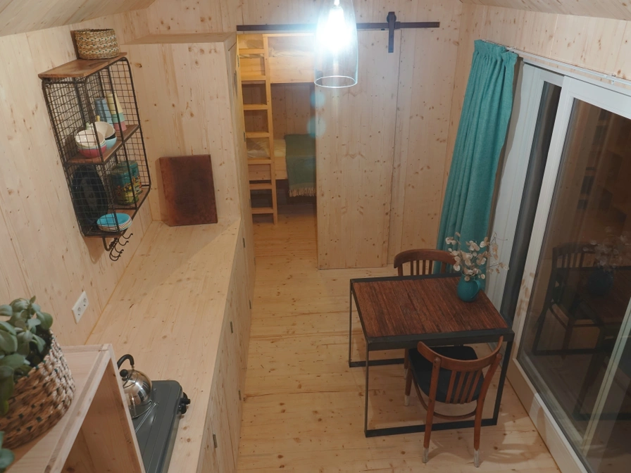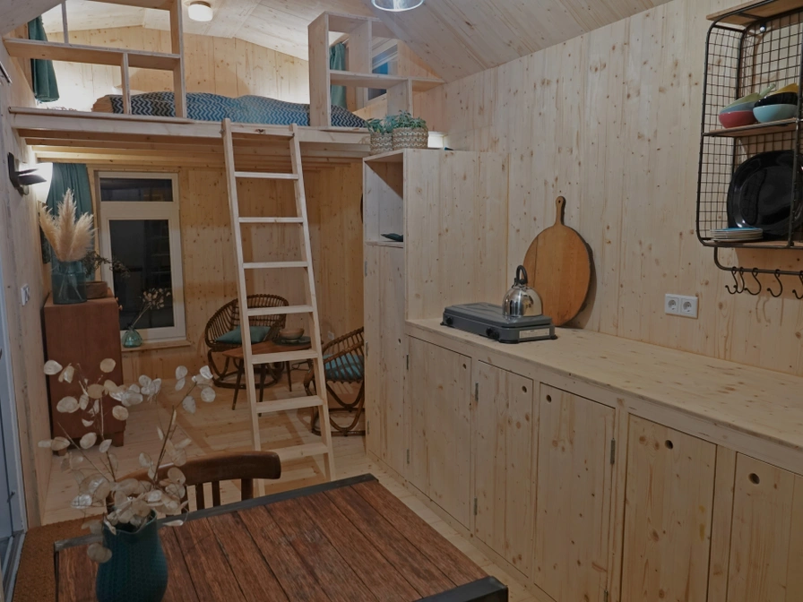 Hecht je waarde aan een duurzame vakantie? Dan is dit zelfgebouwde biobased tiny house de perfecte plek voor jou! Dit huisje biedt ruimte aan vier personen en heeft een tweepersoonsbed op de vide en een stapelbed in een aparte slaapkamer. Het echte kampeergevoel blijft behouden: de douche en wc bevinden zich op loopafstand in het luxe sanitairgebouw van de camping, waar je ook water kunt halen met een jerrycan. Buiten kun je heerlijk ontspannen op het grasveld, waar een tuinset voor je klaarstaat. De keuken is voorzien van een koelkast, koffiezetapparaat, gaskookplaat en alle benodigde potten, pannen en bestek voor vier personen. Dankzij de natuurlijke materialen geniet je hier van een gezond en aangenaam binnenklimaat.