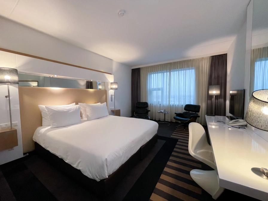 De Comfort Deluxe King kamer is ruime en moderne kamer met veel lichtinval door de grote ramen. Er is een groot kingsize bed en er staan twee comfortabele stoelen in de kamer. Verder is er een ruim bureau met tv en kun je zelf een kopje koffie of thee zetten. De luxe badkamer is erg compleet met een douche, toilet, ligbad en wastafel.