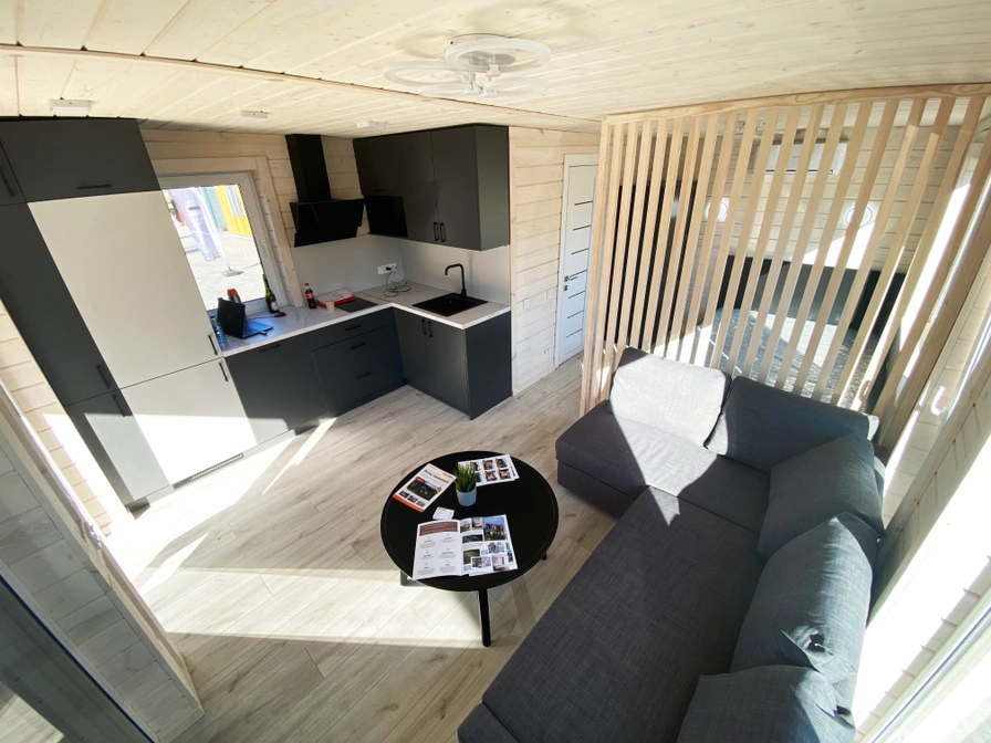 Kom sfeervol overnachten in dit knusse Tiny House. Het Tiny House is gelegen aan het water en vanaf je eigen terras geniet je van het zicht over de jachthaven, camperplaats en het Friese water. Het huisje is ruim opgezet met een flinke keuken die van alle gemakken is voorzien. Zo vind je hier onder andere een koelvriescombinatie, Nespresso apparaat, waterkoker en mini-oven . Er staat een comfortabele bank en even verderop staat het tweepersoonsbed. Tevens beschikt het Tiny House over een eigen badkamer met douche, toilet en wastafel.
